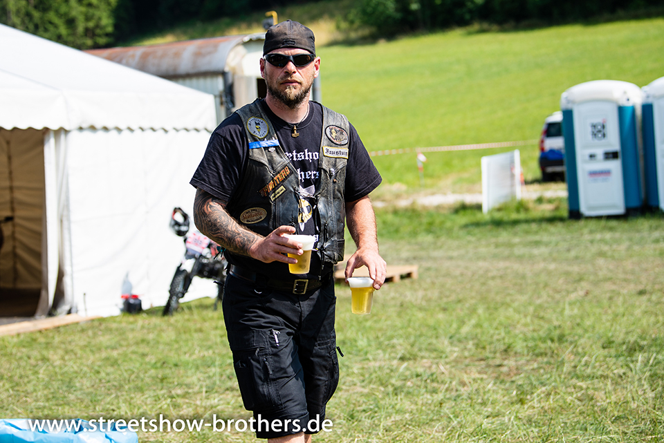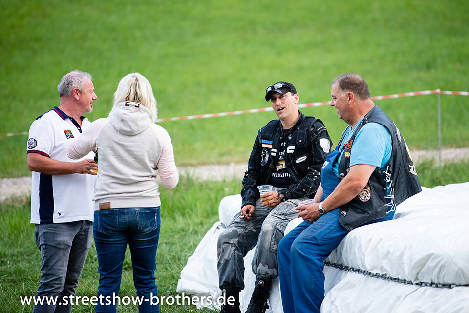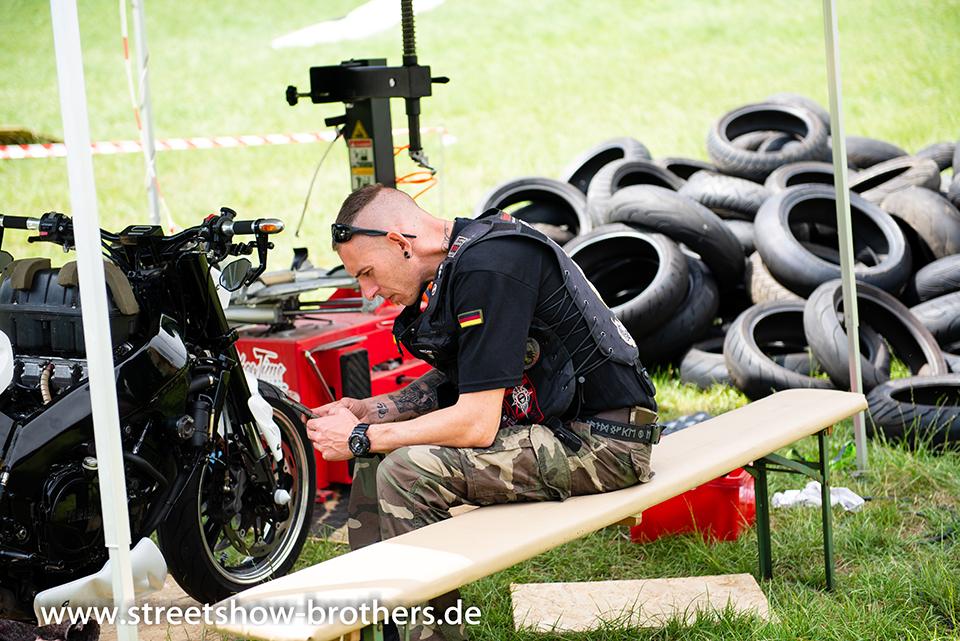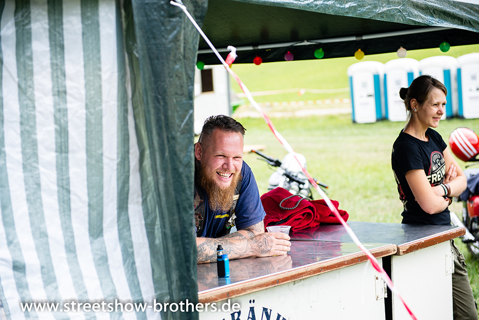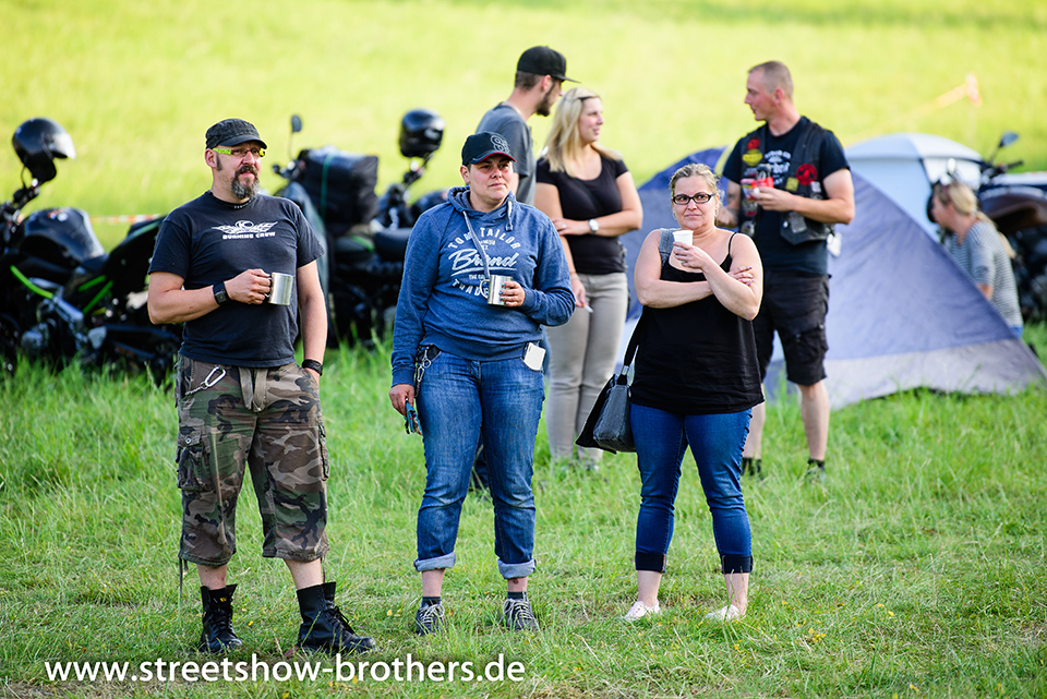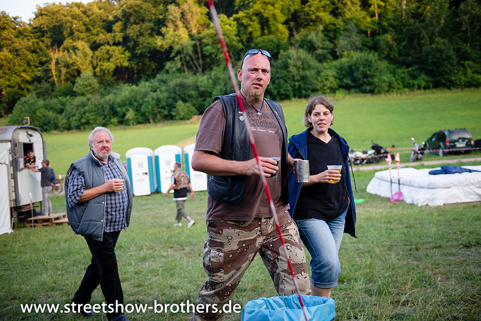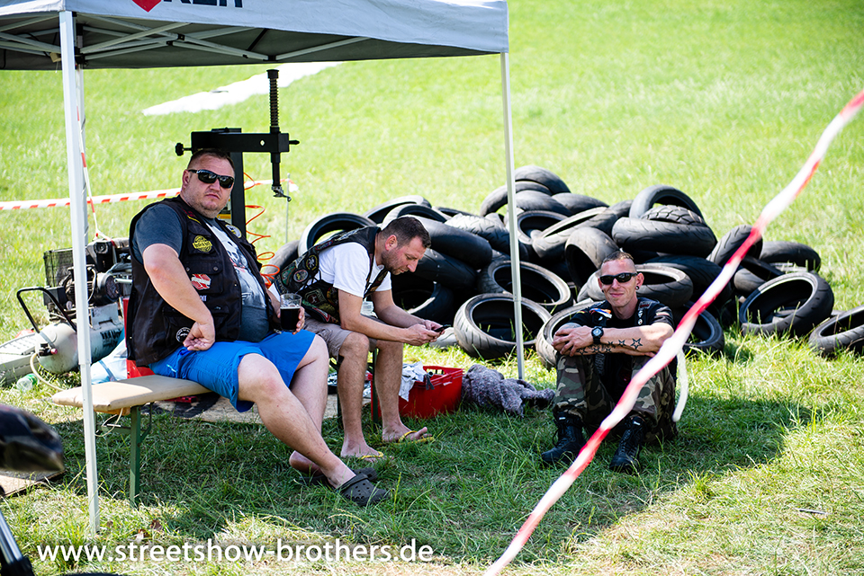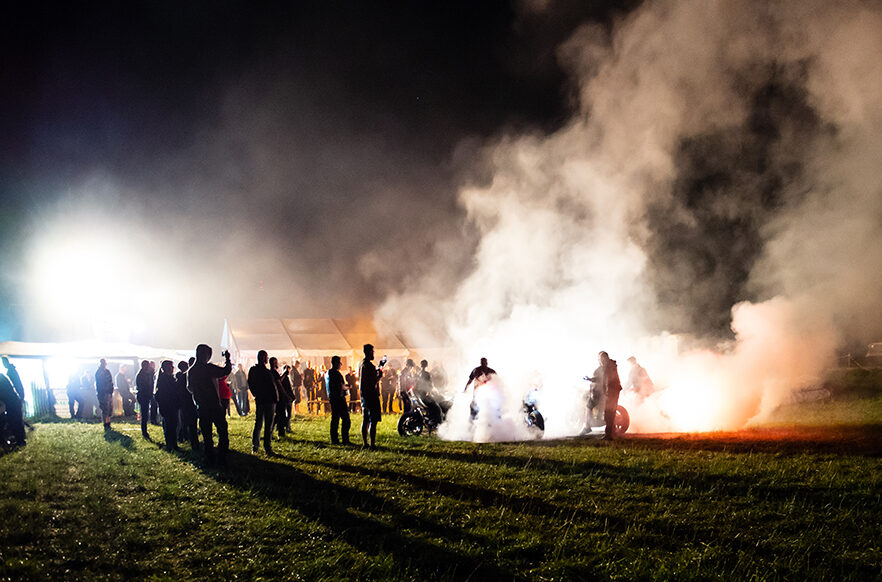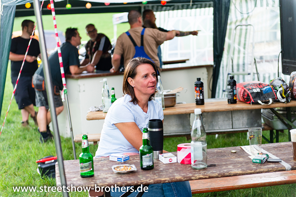 Zwischen Zelten, Bikes und Biertischen herrschte das pure Chaos – aber das gute Chaos. Einer brannte gerade einen fetten schwarzen Streifen in den Boden, während der andere sein Grillgut suchte (meistens direkt neben dem Vorderrad). Überall Gelächter, laute Musik und Menschen, die man kaum kannte, aber trotzdem sofort „Bruder“ nannte.
