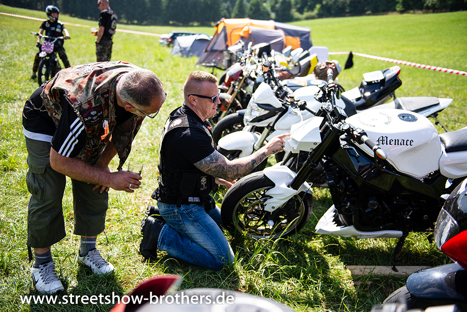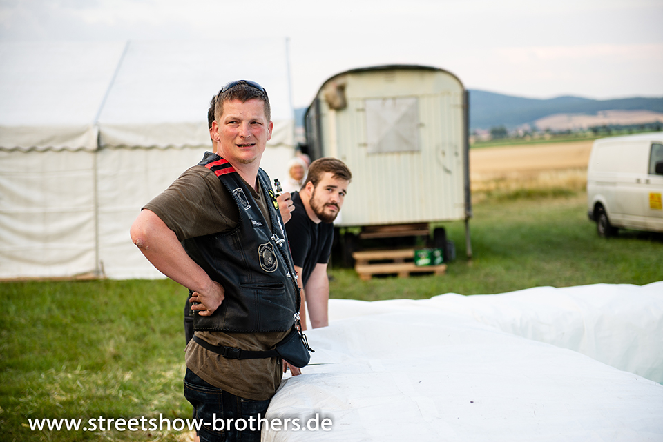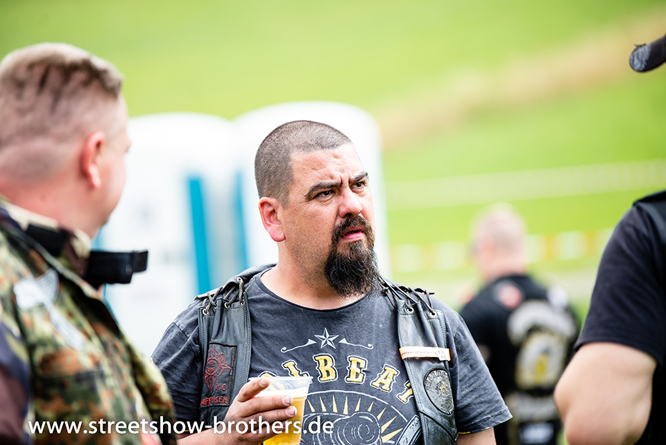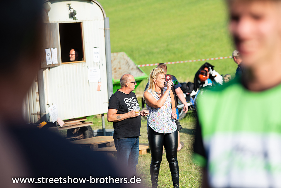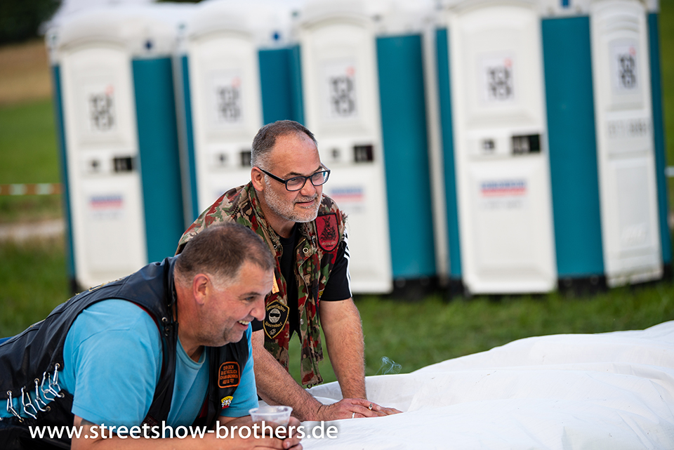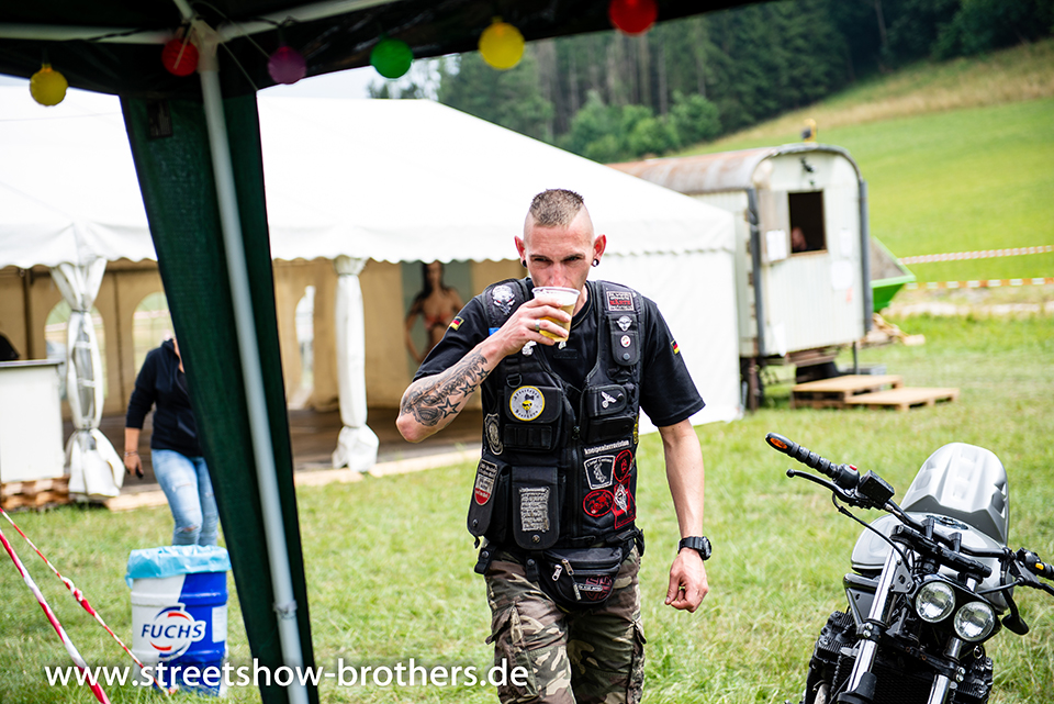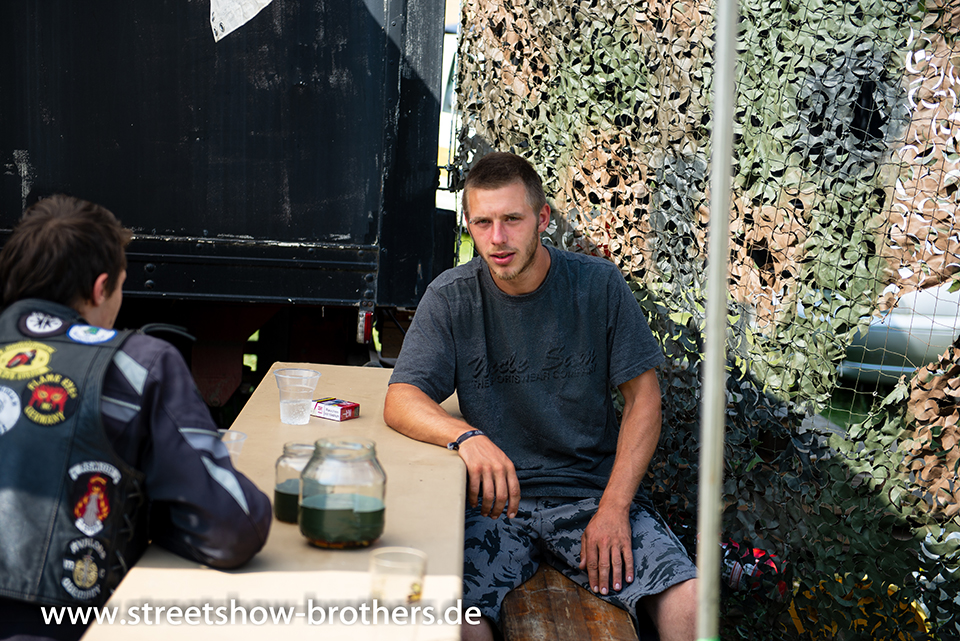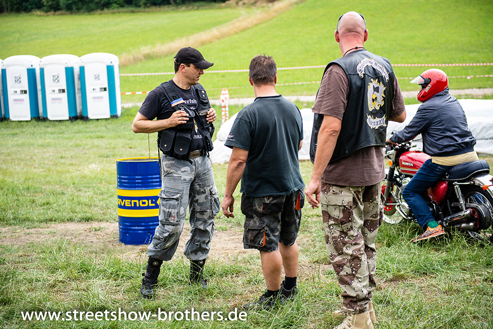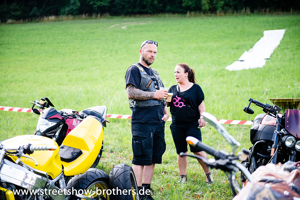 Zwischen Zelten, Bikes und Biertischen herrschte das pure Chaos – aber das gute Chaos. Einer brannte gerade einen fetten schwarzen Streifen in den Boden, während der andere sein Grillgut suchte (meistens direkt neben dem Vorderrad). Überall Gelächter, laute Musik und Menschen, die man kaum kannte, aber trotzdem sofort „Bruder“ nannte.
